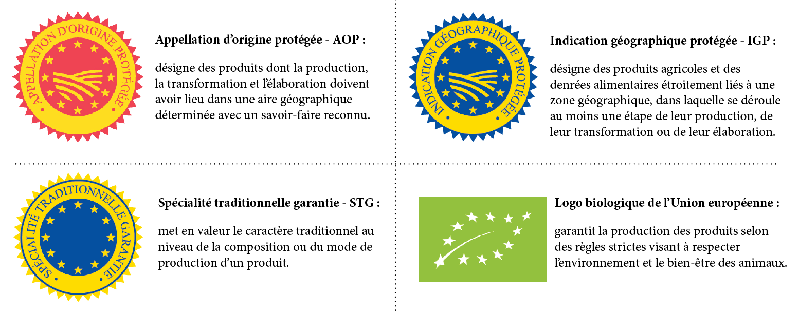 Au niveau européen, l’objectif des appellations d’origine protégées (AOP), des indications géographiques protégées (IGP), des spécialités traditionnelles garanties (STG) ou de l’agriculture biologique n’est pas la reconnaissance d’une sorte de « haute qualité » mais bien la reconnaissance de « caractéristiques particulières » du produit en lien avec une production située dans des zones spécifiques ou régie selon un savoir-faire traditionnel ou une méthode bien identifiée.